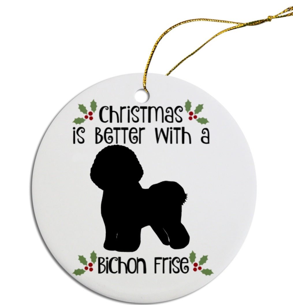 These festive round ceramic ornaments are the perfect way to celebrate the holiday season with your dog. They are light weight and durable, measuring 2-1/2" in diameter. Printed in the USA.